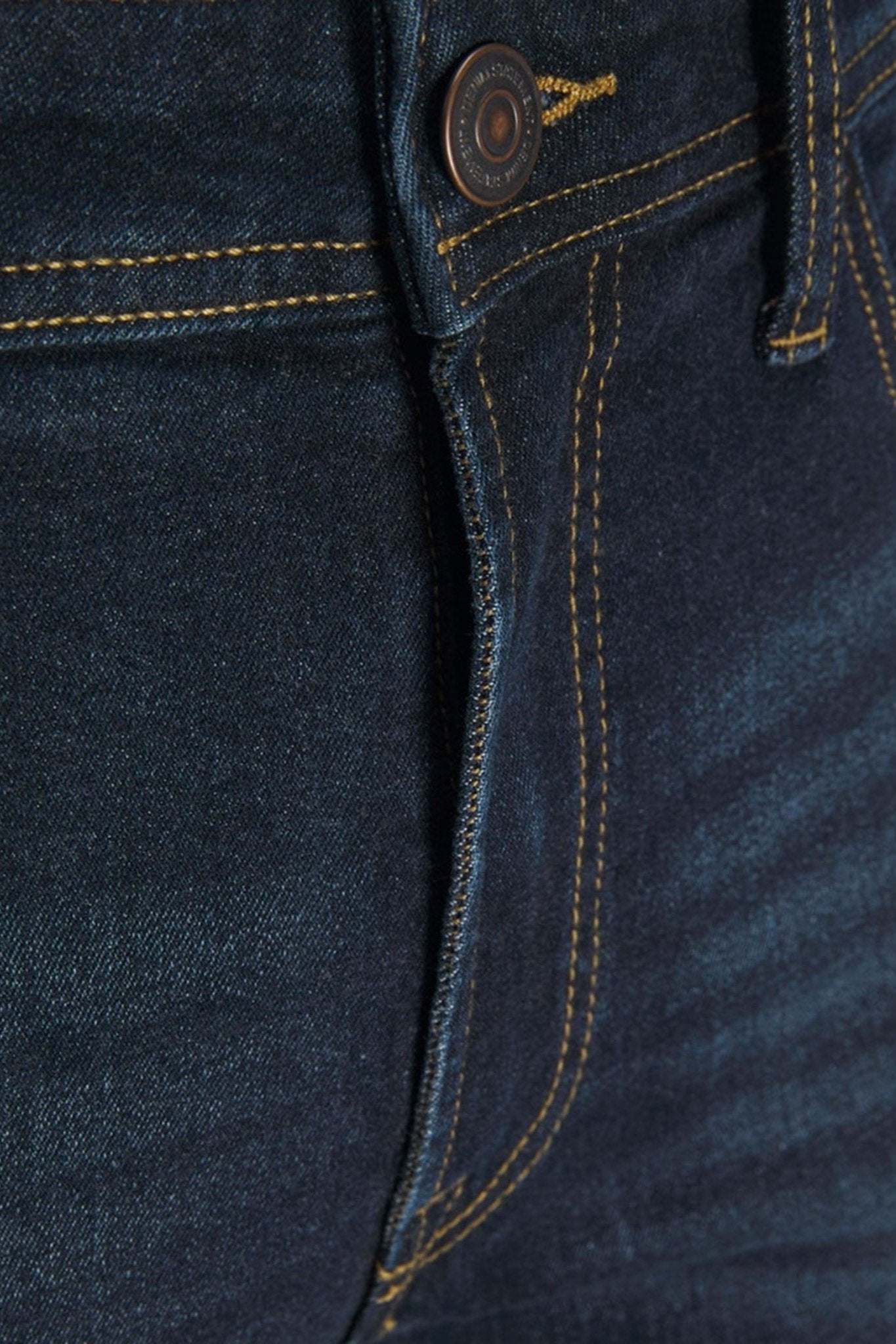 Design: Traditional five-pocket styling with a rich dark blue finish