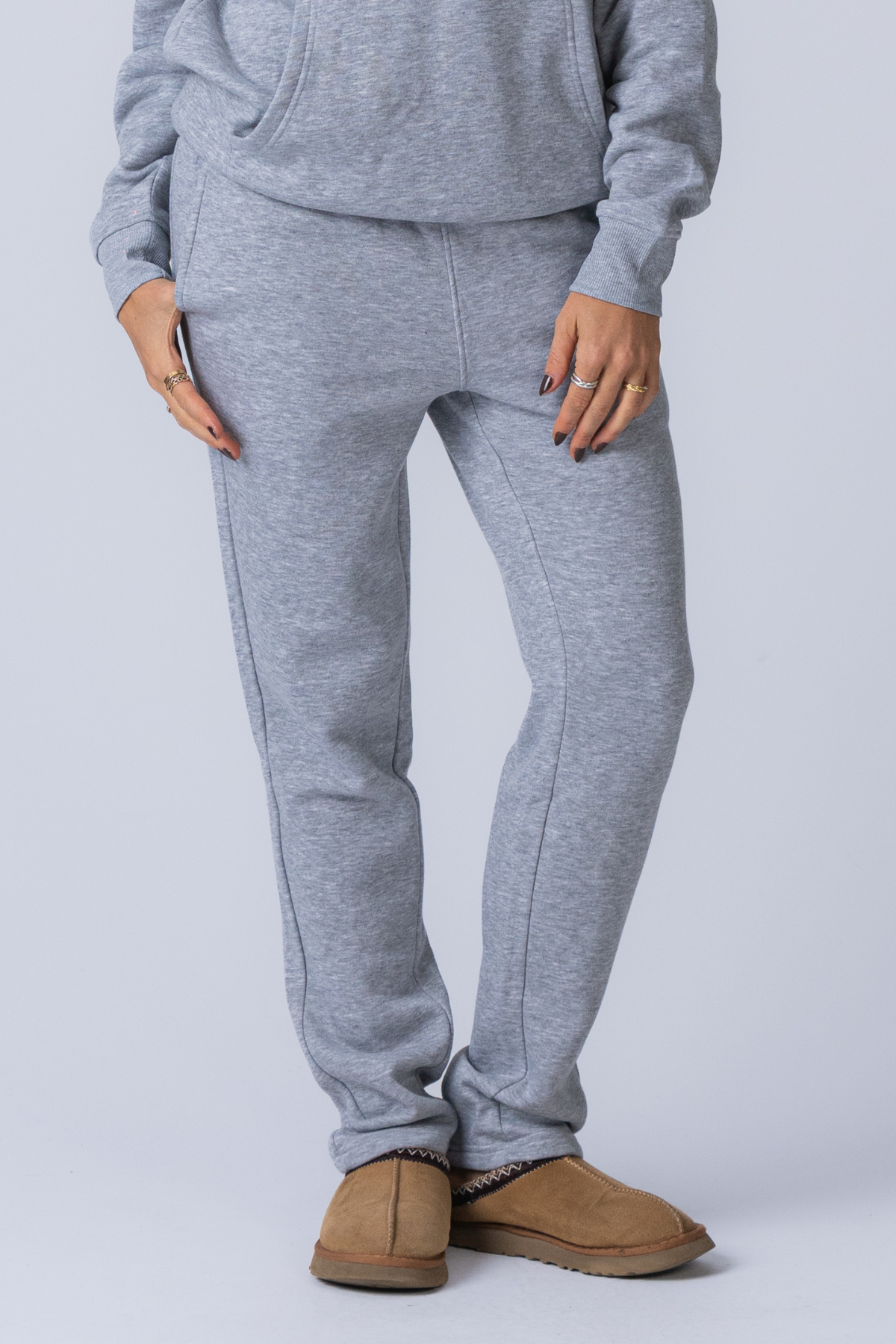 The elegant Grey Melange hue is incredibly versatile, making these sweatpants a cornerstone of your casual collection. It's a classic neutral that pairs beautifully with almost any colour or pattern. Picture yourself curled up on the sofa with a good book and a warm cuppa, enveloped in their cosy embrace. Then, imagine effortlessly transitioning to a coffee run by pairing them with a crisp white tee, your favourite trainers, and a trench coat for a touch of urban polish. For a more put-together casual look, try them with a fitted black roll-neck top, delicate gold jewellery, and a smart leather jacket. The styling possibilities are truly endless, allowing you to express your personal style with ease.