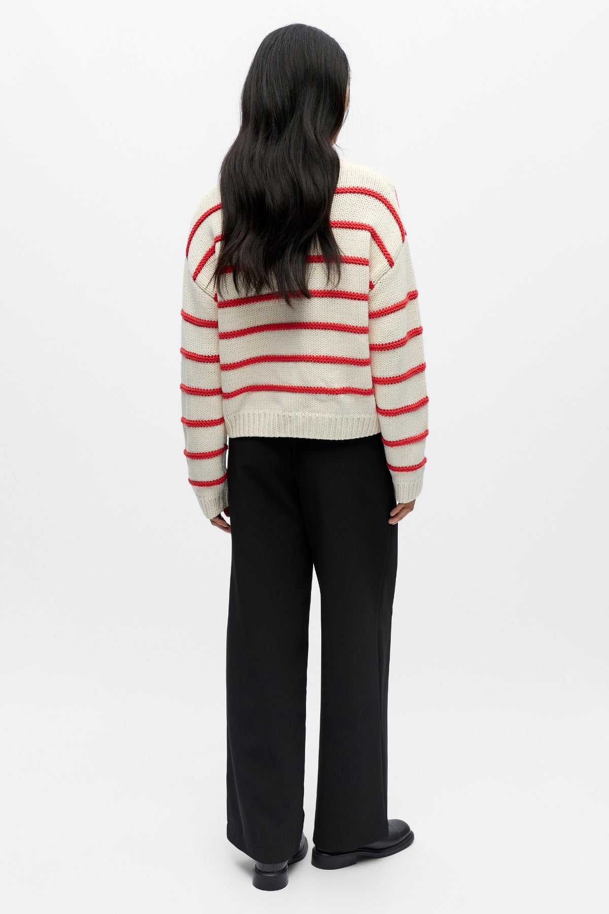 Versatile Wardrobe Staple: This red knit pullover easily transitions from casual daytime looks to more polished evening ensembles.