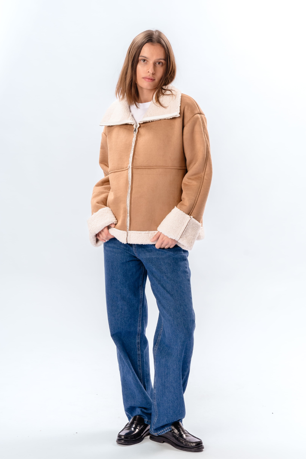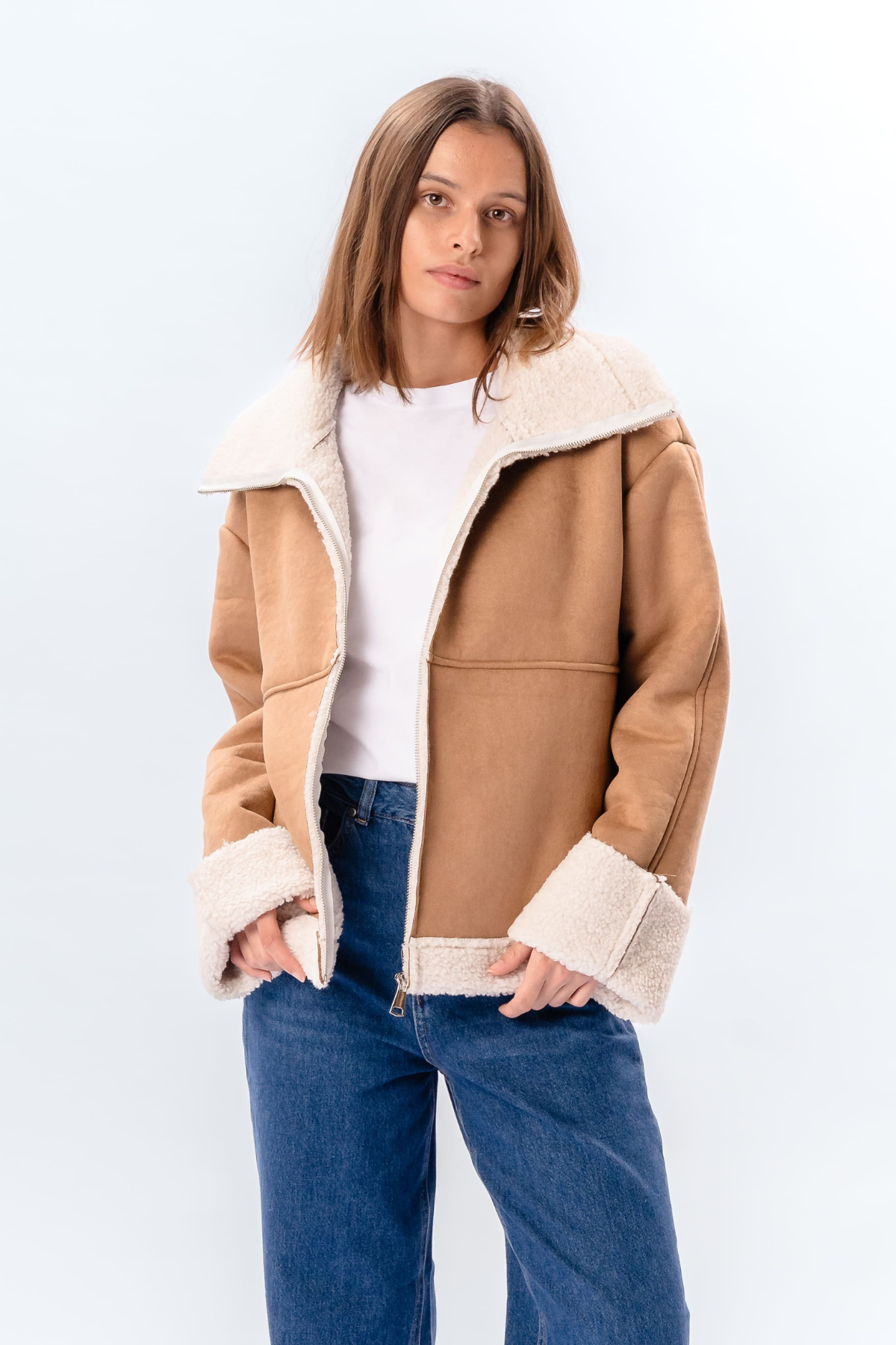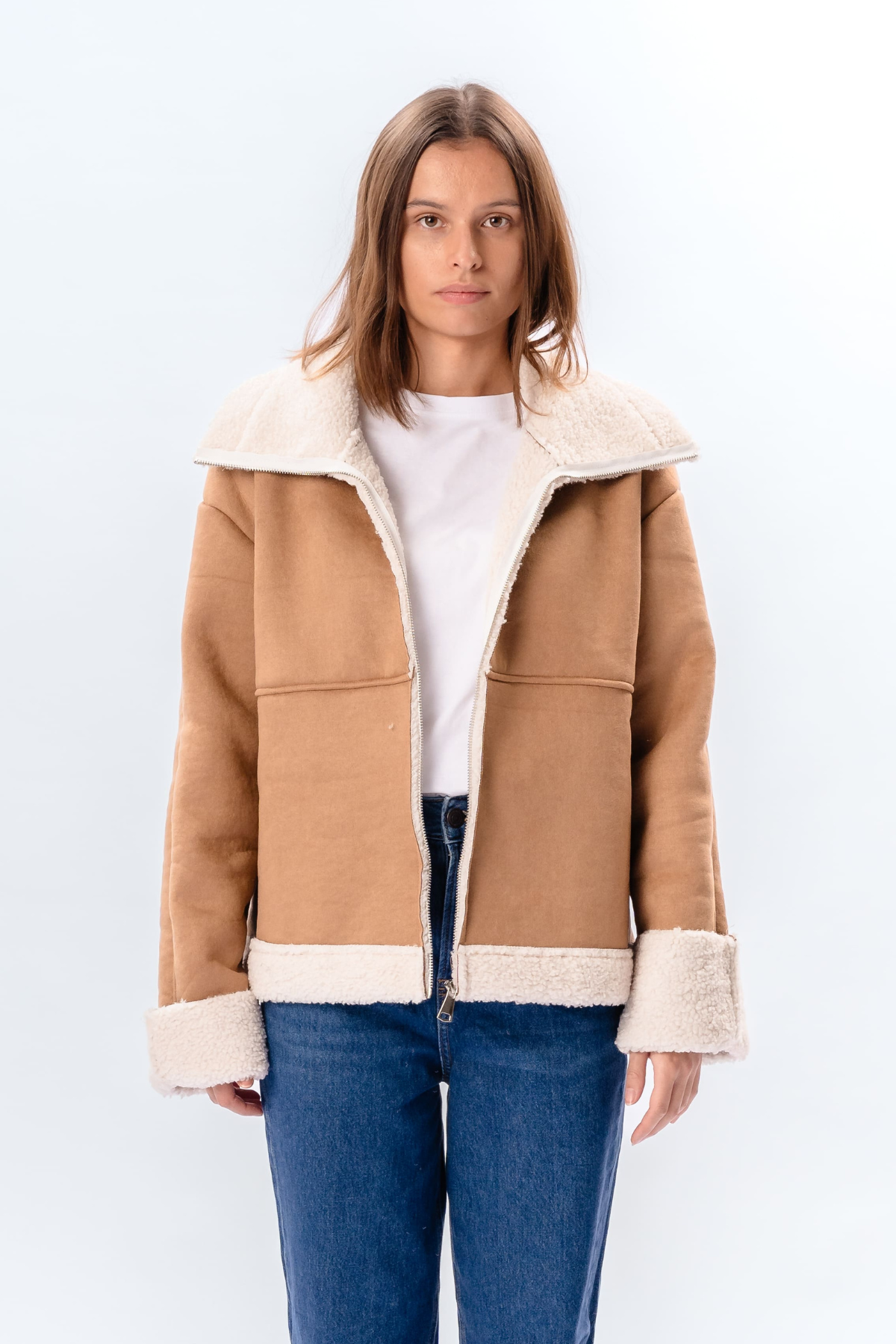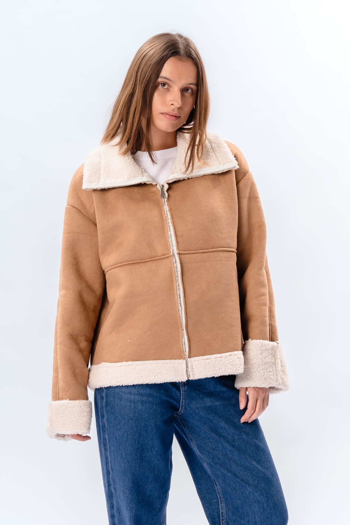 Shearling Zipper Coat - Beige